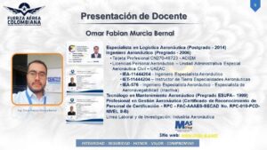 El Ing. OMAR FABIAN MURCIA BERNAL dicta del 12 de julio al 26 de agosto de 2021 el Curso de “Reglamentación Aeronáutica Militar” al personal de la Tecnología de Electrónica Aeronáutica (TEA) de la “Escuela de Suboficiales CT. Andrés M. Díaz – ESUFA” (https://www.fac.mil.co/esufa) (Institución de Educación Superior – IES) de la Fuerza Aérea Colombiana (FAC). De acuerdo a lo establecido en los Programas Académicos de esta IES, los futuros Tecnólogos en Electrónica Aeronáutica (TEA), deben adquirir en conocimiento necesario para desempeñarse en los procesos de mantenimiento de primer nivel de los sistemas eléctricos y electrónicos en aeronaves tripuladas y no tripuladas a disposición de la FAC. Por tal motivo, se hizo necesario el desarrollo de información y conocimiento relacionado con en el manejo y uso de los documentos de gestión de la institución, así como de manuales, publicaciones técnicas, órdenes técnicas, boletines y formularios utilizados para el desarrollo de mantenimiento de las aeronaves de la institución, fortaleciendo con esto que las actividades se desarrollen dentro de niveles aceptables de Seguridad Operacional. El Ing. OMAR FABIAN MURCIA BERNAL agradece la confianza y el apoyo dado por parte de los Directivos y Jefes de Programa para que este proceso se desarrollara de manera satisfactoria y a conformidad con los lineamientos de esta IES.