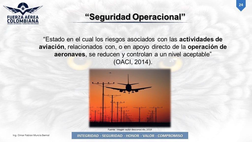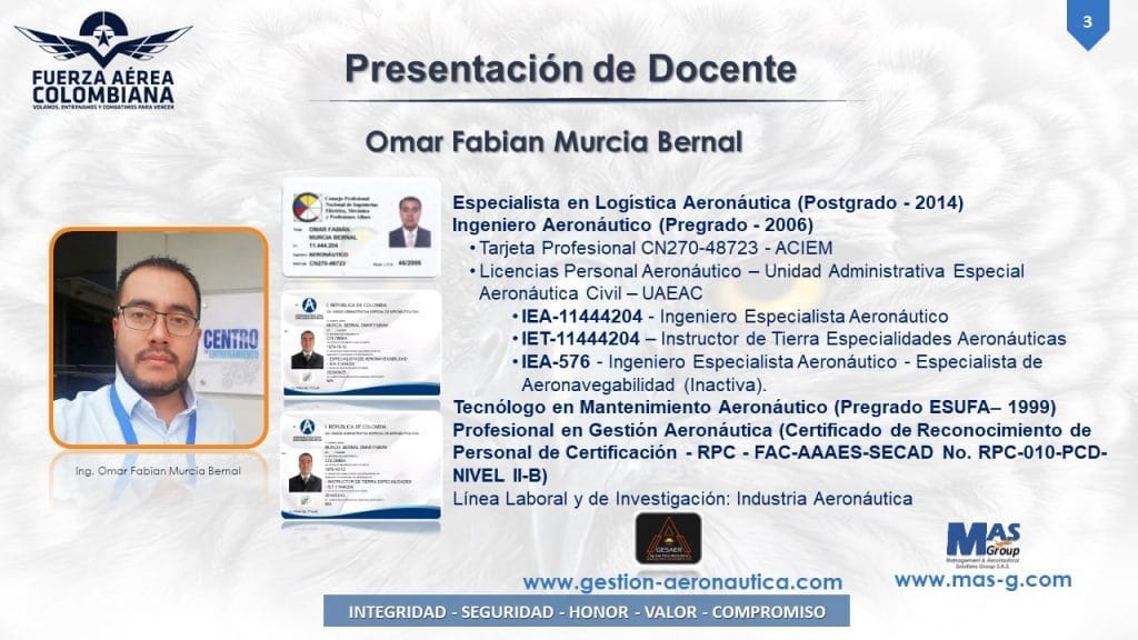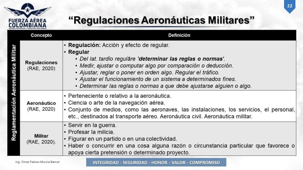 El Ing. OMAR FABIAN MURCIA BERNAL dicta del 27 de julio al 06 de septiembre de 2021 el Curso de “Regulaciones Aeronáuticas Militares” al personal de la Tecnología de Mantenimiento Aeronáutico (TMA) de la “Escuela de Suboficiales CT. Andrés M. Díaz – ESUFA” (https://www.fac.mil.co/esufa) (Institución de Educación Superior – IES) de la Fuerza Aérea Colombiana (FAC). De acuerdo a lo establecido en los Programas Académicos de esta IES, los futuros Tecnólogos en Mantenimiento Aeronáutico (TMA), deben adquirir en conocimiento necesario para desempeñarse en los procesos de mantenimiento de las Aeronaves Tripuladas y No Tripuladas de la FAC. Por tal motivo, se hizo necesario el desarrollo de temáticas relacionadas con el manejo y uso de los documentos de gestión de la institución, así como de manuales, publicaciones técnicas, órdenes técnicas, boletines técnicos y de servicios, e identificación de prácticas estándar y formularios utilizados para el desarrollo del mantenimiento de las aeronaves de la institución, fortaleciendo con esto que las actividades se desarrollen dentro de niveles aceptables de Seguridad Operacional. El Ing. OMAR FABIAN MURCIA BERNAL agradece la confianza y el apoyo dado por parte de los Directivos y Jefes de Programa para que este proceso se desarrollara de manera satisfactoria y a conformidad con los lineamientos de esta IES.